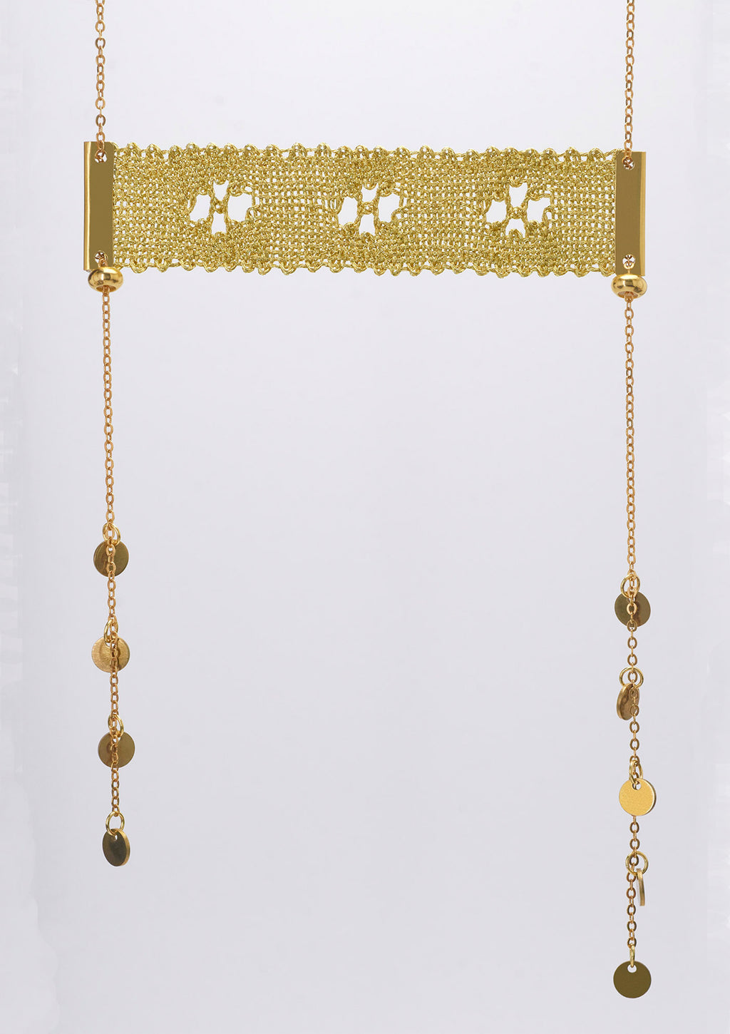 A fascinating necklace with four leaf clover-like designs. All metal components have 24 karat gold plating. The necklace’s height can be changed in length with the help of two adjustable 24k gold plated brass beads.